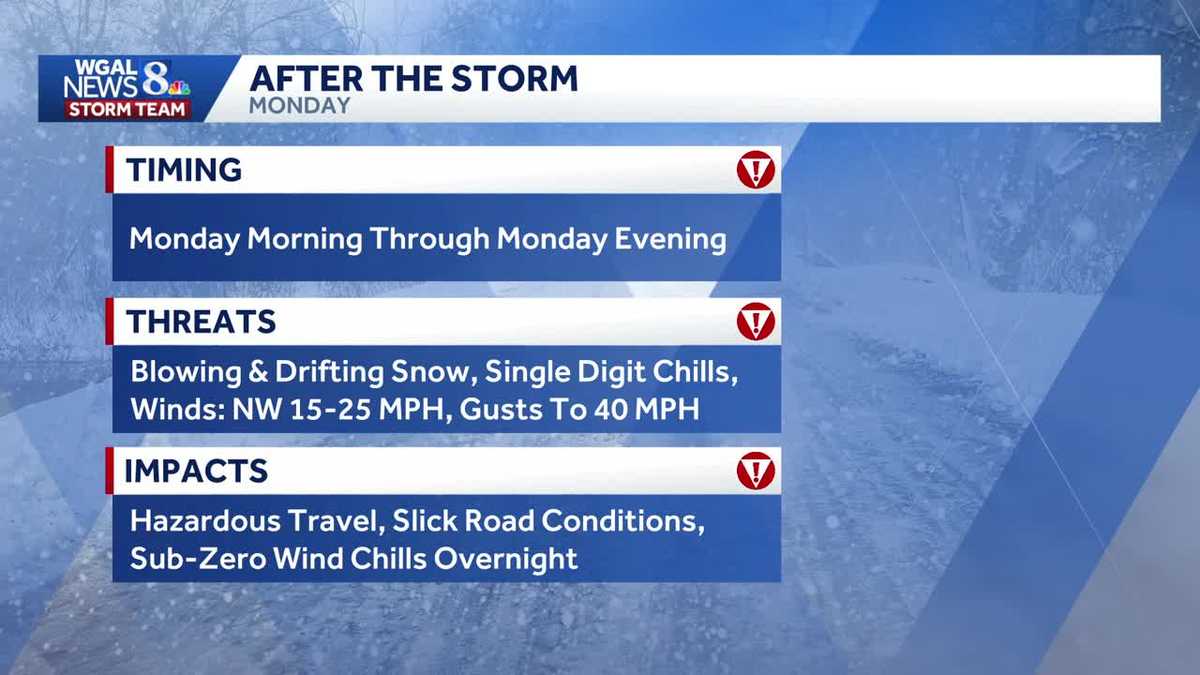 Una tormenta invernal llegó a su fin el domingo por la noche después de traer nieve, aguanieve y lluvia helada al centro-sur de Pensilvania. Un aviso de tormenta invernal, emitido por el Servicio Meteorológico Nacional, está vigente hasta la 1 p.m. del lunes. El lunes sigue siendo un Día de Alerta, lo que significa un día que presenta la amenaza de un clima extremo, severo y posiblemente mortal debido a la nieve acumulada y las temperaturas con sensación térmica bajo cero.