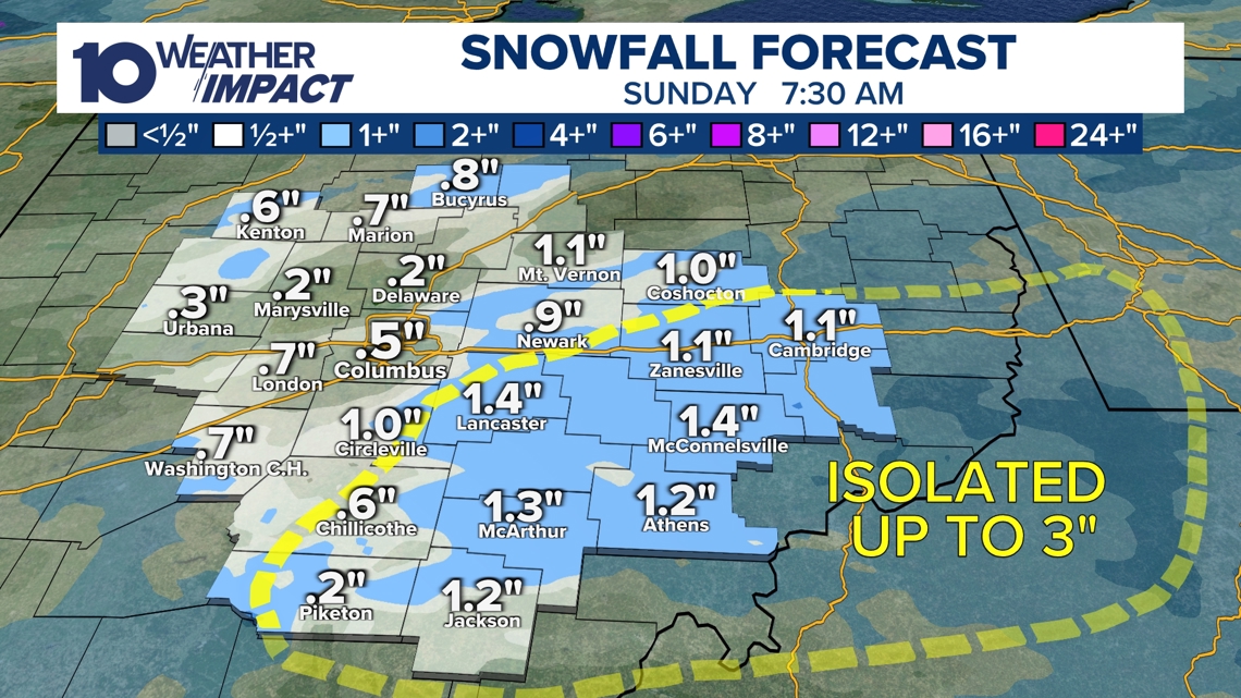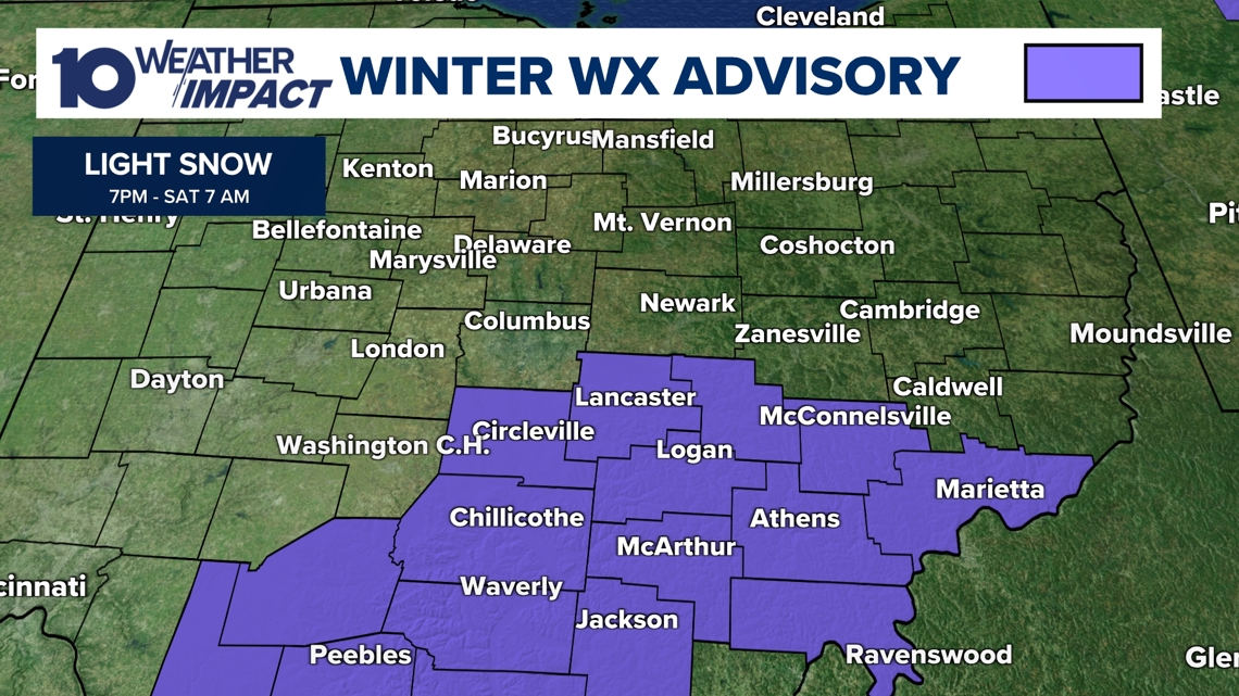 Un Asesoramiento de Clima Invernal está vigente para los condados de Athens, Morgan, Perry, Fairfield, Hocking, Pickaway, Pike y Ross hasta la mañana del sábado. Si bien muchas áreas solo recibirán nevadas ligeras, las zonas más altas y las áreas al sur y al este de Columbus podrían acumular entre 2 y 7 centímetros de nieve durante la noche y a primera hora del sábado.