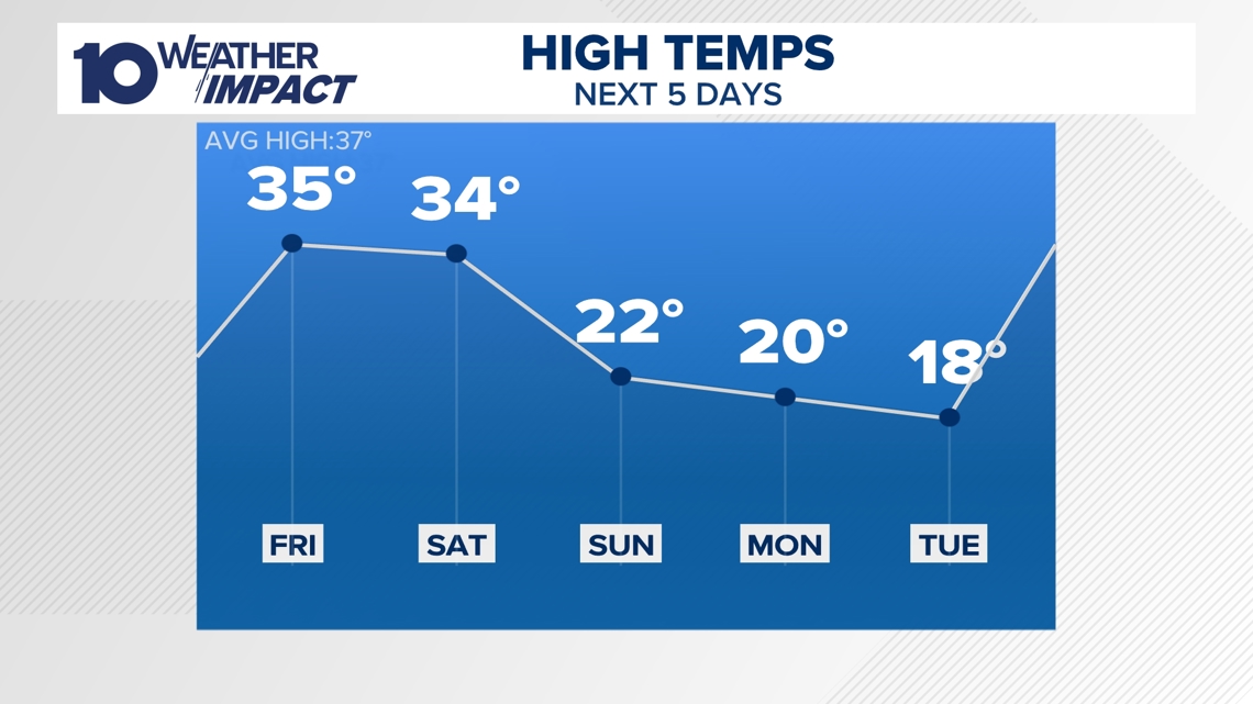 Después de que la nieve se retire el sábado, las condiciones frías solo empeorarán el domingo, con temperaturas en descenso a medida que avanzamos hacia el final del fin de semana y principios de la próxima semana. Se espera que las temperaturas máximas se mantengan en los 20 grados Fahrenheit o menos desde la tarde del domingo hasta al menos la tarde del martes.