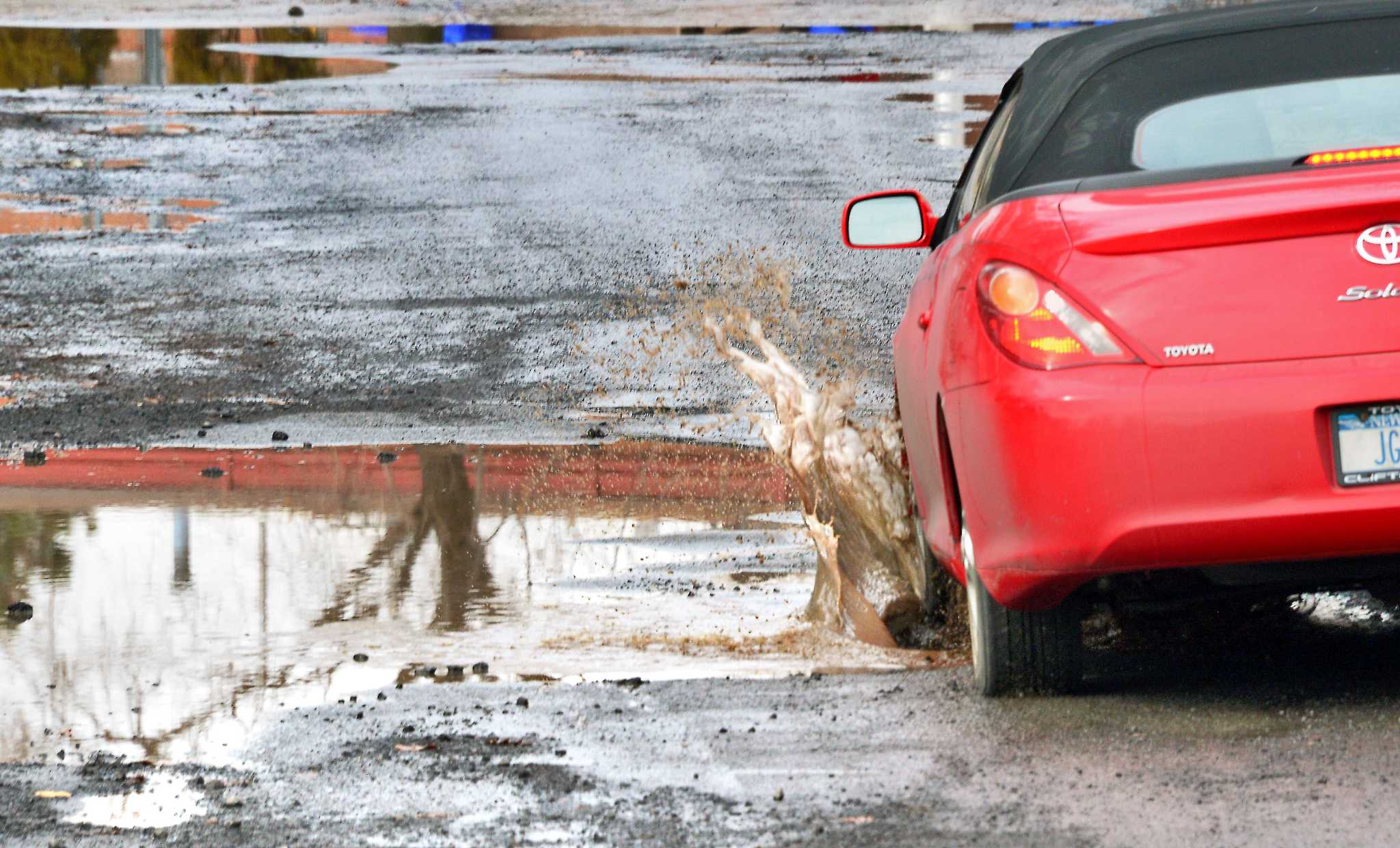… A car splashes through water-filled potholes on Hawkins Street in Albany in February 2018. Mayor Dorcey Applyrs on Friday …