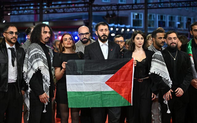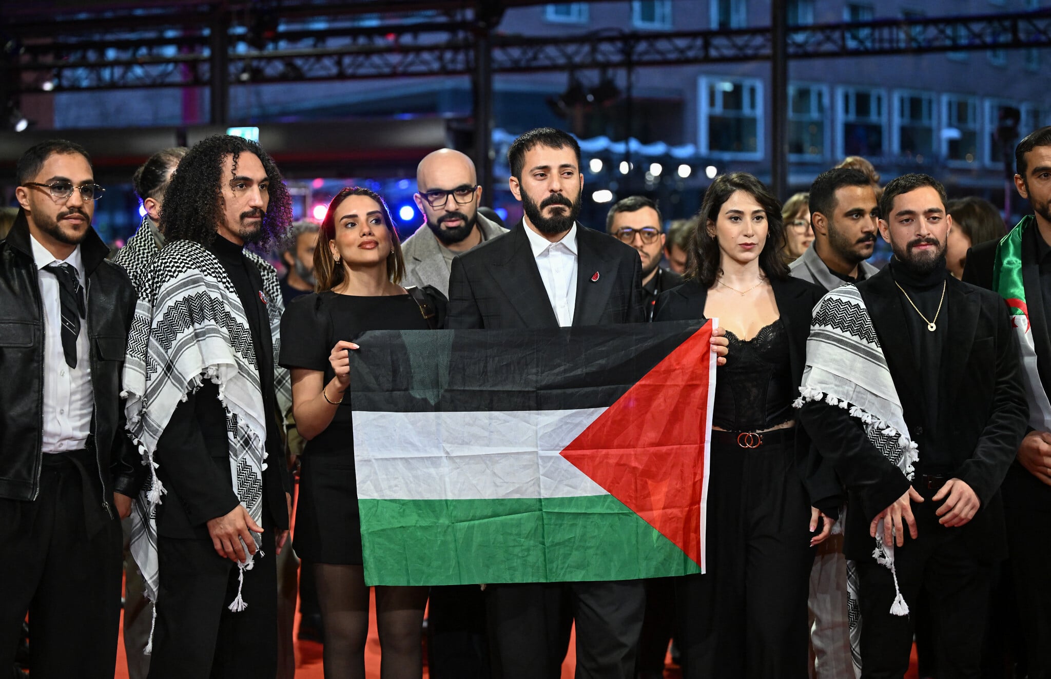 Filmmakers hold a Palestinian flag as they arrive at the red carpet for the Award Ceremony of the 76th Berlinale, Europe’s first major film festival of the year, in Berlin on February 21, 2026. (RALF HIRSCHBERGER / AFP)