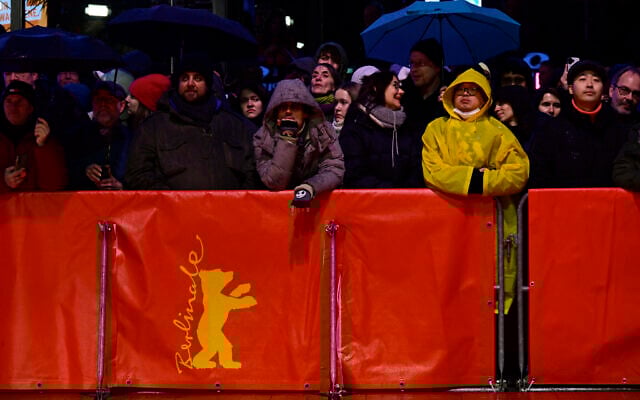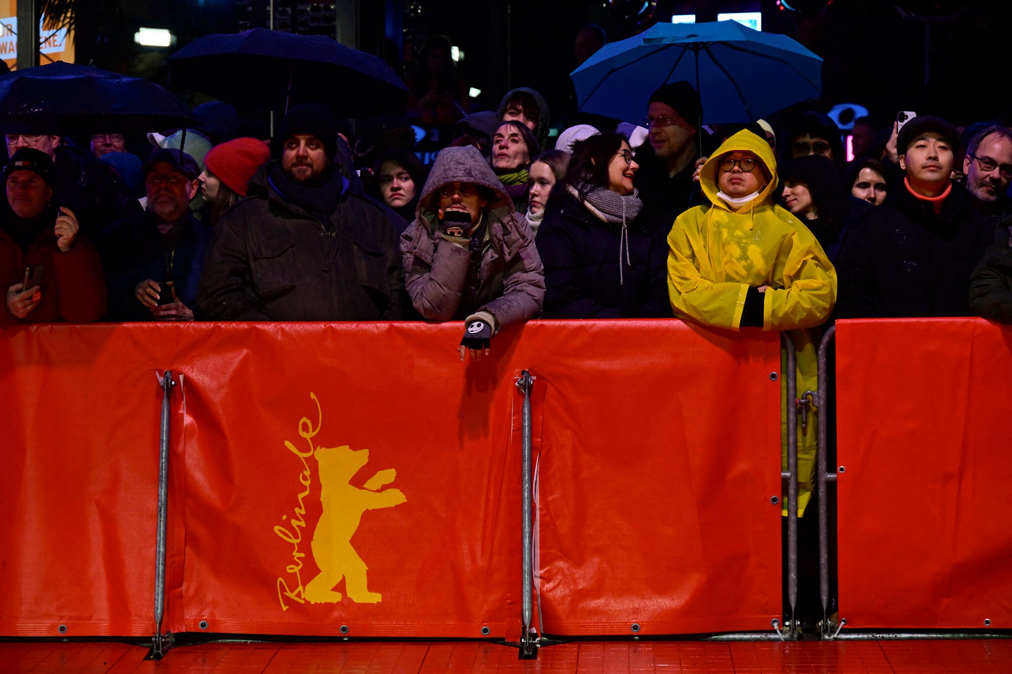 Fans wait in the rain near the red carpet for the Award Ceremony of the 76th Berlinale, Europe’s first major film festival of the year, in Berlin on February 21, 2026. (John MACDOUGALL / AFP)