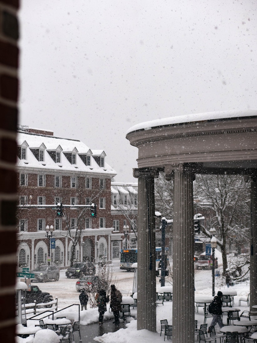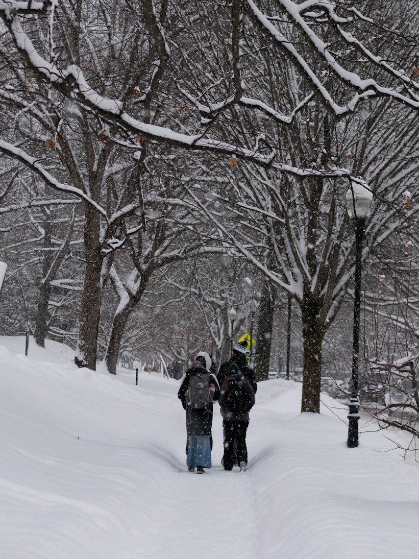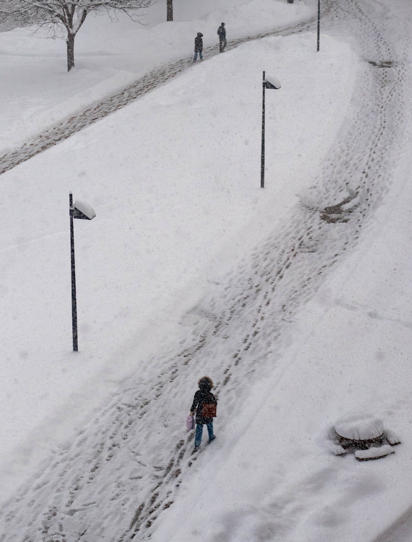 La nieve llega al campus sin importar horarios ni planes de estudio, infiltrándose en los espacios por donde los estudiantes suelen apresurarse. Los caminos se estrechan, los edificios parecen distanciarse y lo familiar se vuelve momentáneamente desconocido. Entre una clase y otra, el tiempo se extiende lo suficiente para notar el vaho en el aire, la luz en las ventanas y el sonido de los pasos atenuados por la nieve. Estas fotografías capturan ese instante intermedio, donde el movimiento continúa, pero la urgencia disminuye, y el campus aprende a moverse al ritmo del invierno.