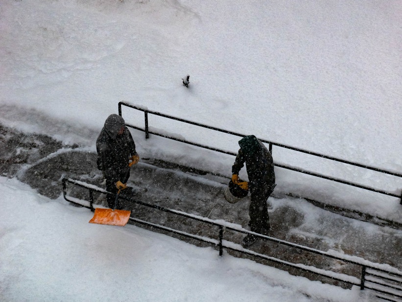 Two members of the College’s Facilities Operations and Management team shovel snow and salt sidewalks on Jan. 26.