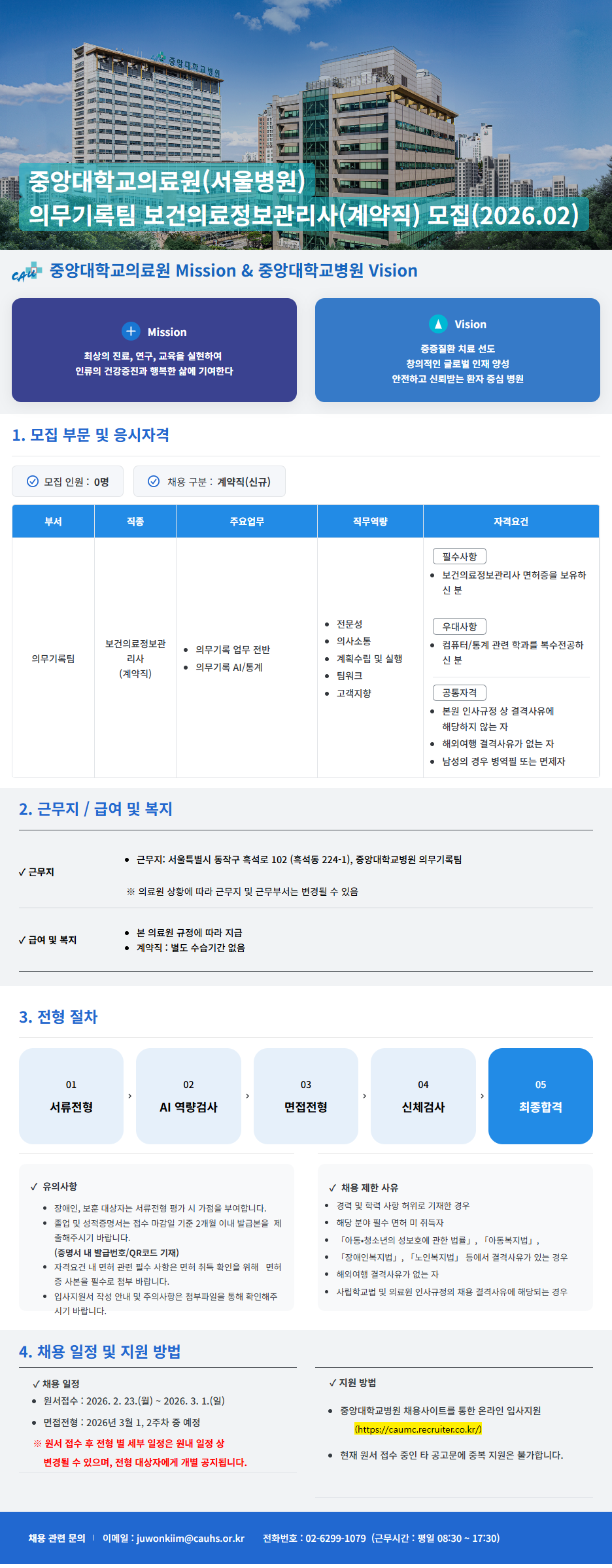 El puesto de trabajo se encuentra en el departamento de seguros médicos del Hospital Universitario de la Universidad Central de Corea, ubicado en el distrito de Dongjak, Seúl. Las responsabilidades incluyen la revisión y facturación de reclamaciones médicas.