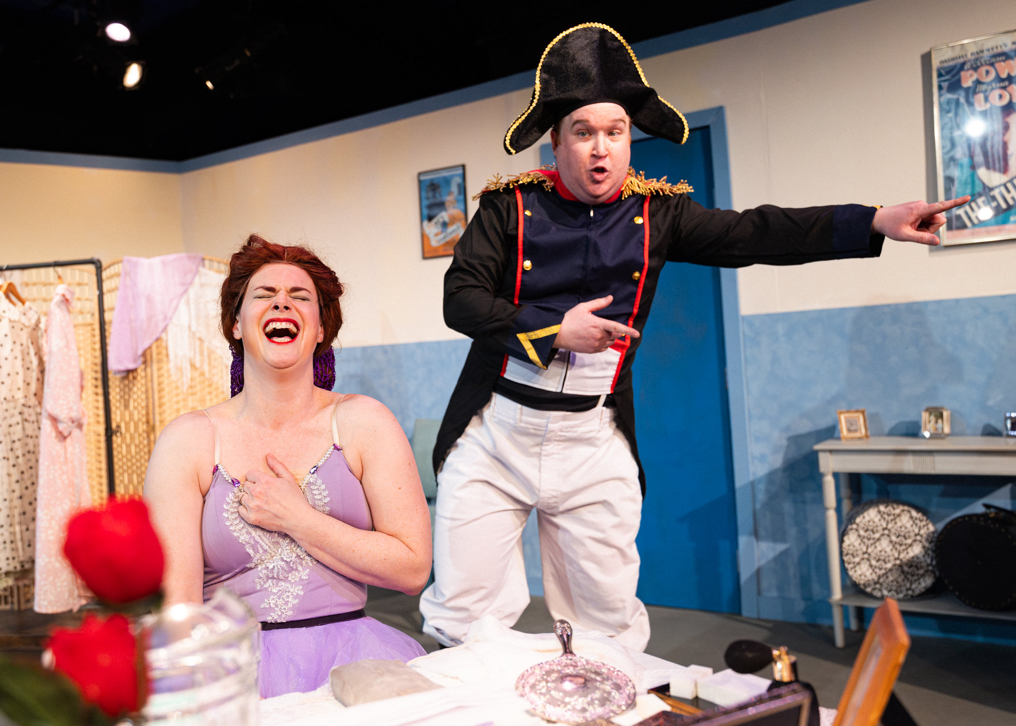 Toda la acción se desarrolla en el camerino de Maggie. El decorado de Joe Larkin, con utilería de Meg X. McGrath, está decorado con cariño para reflejar la época, con una percha llena de vestidos abullonados y brillantes, una mesa de centro ovalada con revistas antiguas del mundo del espectáculo, un carrito de licores bien surtido e incluso un televisor de madera cuadrado. El público puede escuchar fragmentos del programa “For Pete’s Sake” mientras Maggie y Eddie están fuera de escena.
