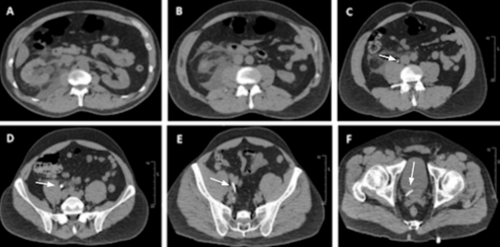 En el caso presentado, un paciente con antecedentes de ureterolitiasis se sometió a una TC sin contraste. La imagen reveló una estructura lineal que inicialmente se interpretó como un stent ureteral. Sin embargo, tras una evaluación más exhaustiva, se determinó que la estructura era en realidad contraste intravenoso retenido de un estudio previo.