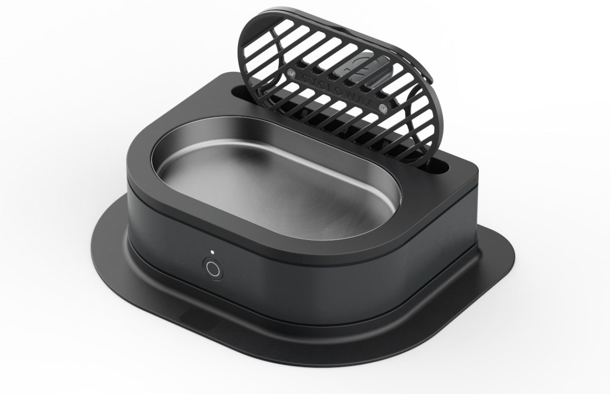 Una vez transcurridos unos minutos en el baño de cera caliente, el soporte se retira sin riesgo de quemaduras ni goteos, y se coloca en un pequeño compartimento lateral del kit para permitir que la cera se seque y enfríe antes de extraer la cadena recién encerada. Todo el proceso tarda aproximadamente 10 minutos.