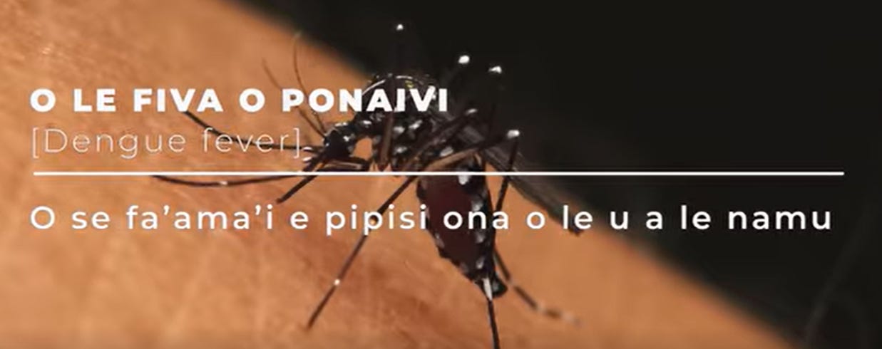 Aunque las hospitalizaciones han sido bajas en meses anteriores, desde enero de 2026 se ha observado un aumento en el número de personas que presentan síntomas similares al dengue en los centros de salud. Si bien las hospitalizaciones eran escasas anteriormente, el virus del dengue sigue activo y es importante que todos continúen practicando medidas preventivas. Se mantiene la vigilancia sanitaria, con una mayor concentración de casos observada recientemente en el noroeste de Upolu, particularmente en Vaimauga a Sagaga, y en Savaii, principalmente en los distritos de Faasaleleaga y PalauIi. Sin embargo, el dengue es endémico en Samoa y se transmite por mosquitos, que pueden reproducirse en cualquier lugar. Por lo tanto, se alienta a todas las comunidades a tomar precauciones.