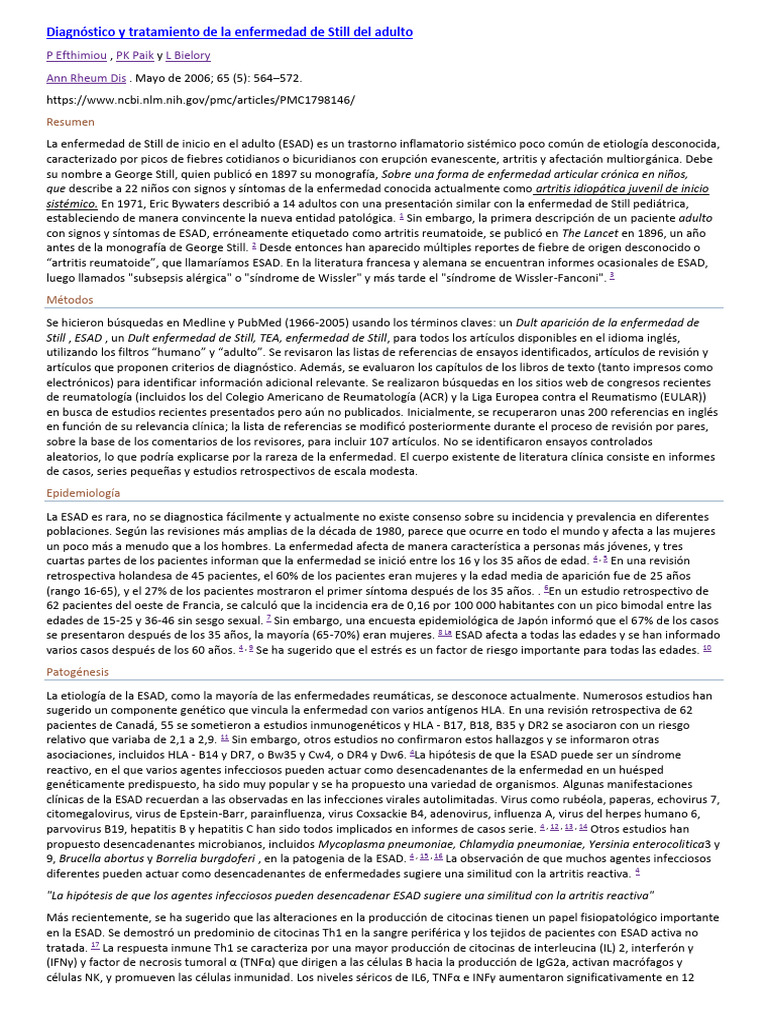 Tras obtener resultados negativos en las pruebas realizadas para detectar condiciones infecciosas y autoinmunes, se ha determinado un diagnóstico de enfermedad de Still del adulto. Esta condición se caracteriza por ser una enfermedad poco común.