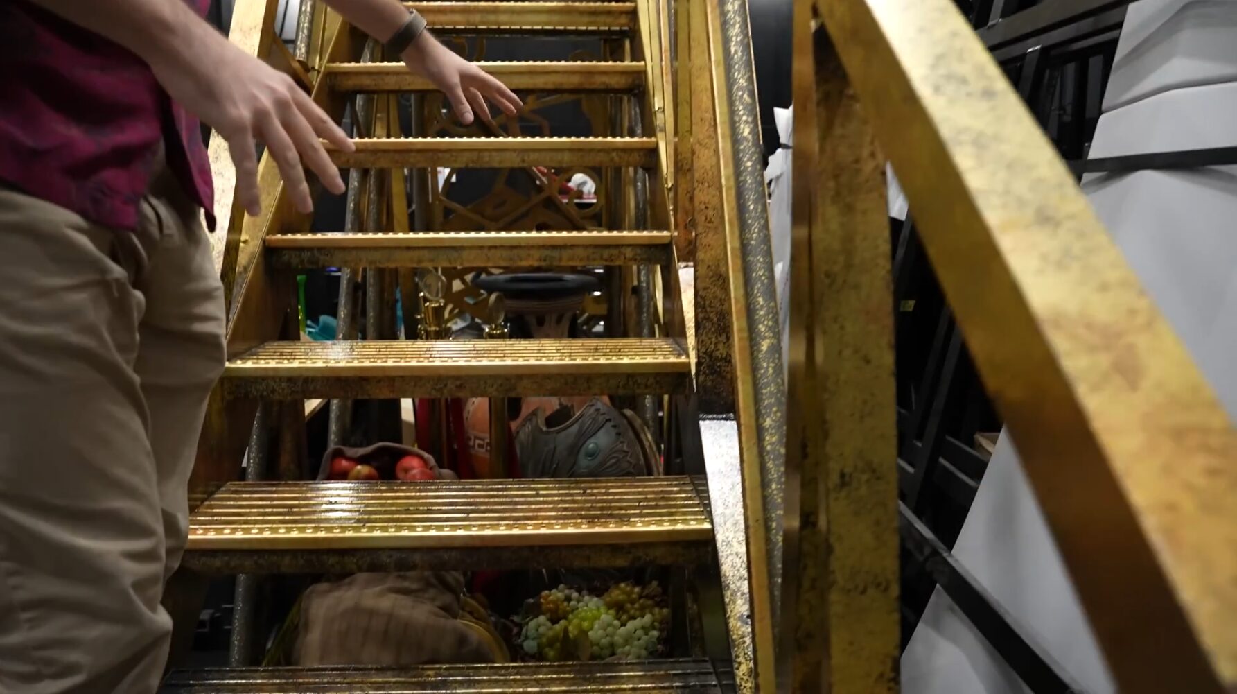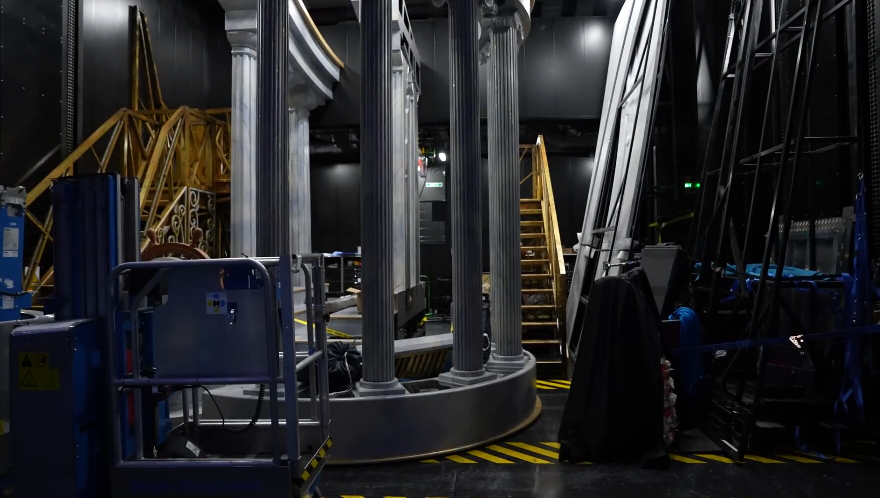 Como señalan, la escenografía de columnas utilizada para Hercules literalmente toca el techo en el área de almacenamiento. El equipo aprovecha al máximo todo el espacio posible. Por ejemplo, las escaleras con ruedas utilizadas en el escenario se convierten en almacenamiento para pequeños accesorios entre bastidores.