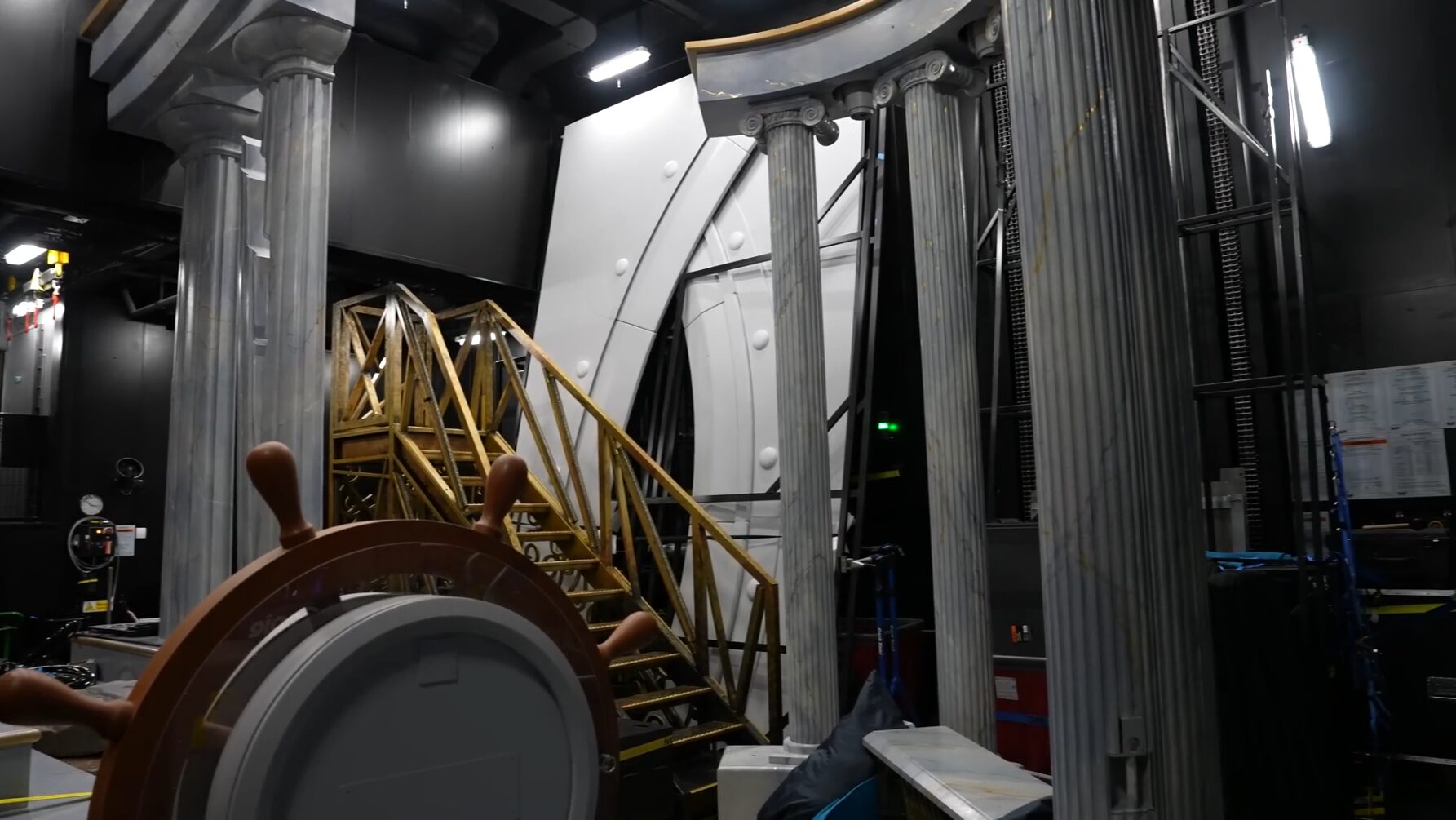 El secreto para montar tres espectáculos complejos en un teatro en menos de una semana reside en la escenografía plegable que se puede “encajar” en este pequeño espacio de la cubierta 2. Los Imagineers planifican realmente cómo encajará todo en este espacio antes de que se construya algo.