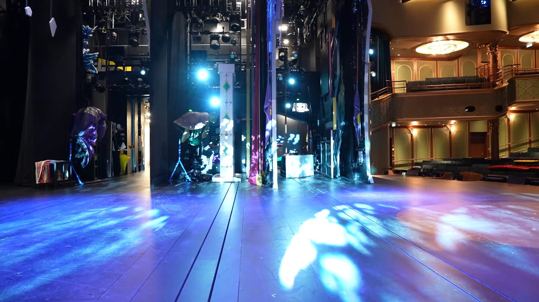 El trío de Imagineers nos lleva en un recorrido detrás de escena y por debajo de las cubiertas del Walt Disney Theater en el Disney Destiny, que ofrece tres espectáculos de calidad Broadway: Frozen: A Musical Spectacular, Disney Hercules y Disney Seas the Adventure. El teatro ocupa espacio en las cubiertas 3 a 5, pero también cuenta con un espacio de almacenamiento oculto en la cubierta 2, y es precisamente este espacio compacto el que determina la escala y la complejidad de la escenografía que el equipo puede crear.