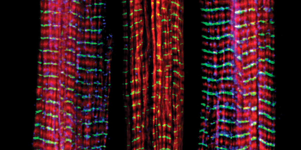 De las tres fibras musculares que se muestran aquí, la de la derecha y la de la izquierda son normales. La fibra del medio carece de una gran proteína llamada nebulina (azul). La nebulina desempeña un número de roles en la estructura y función de los músculos, y su ausencia está asociada con ciertos trastornos neuromusculares.