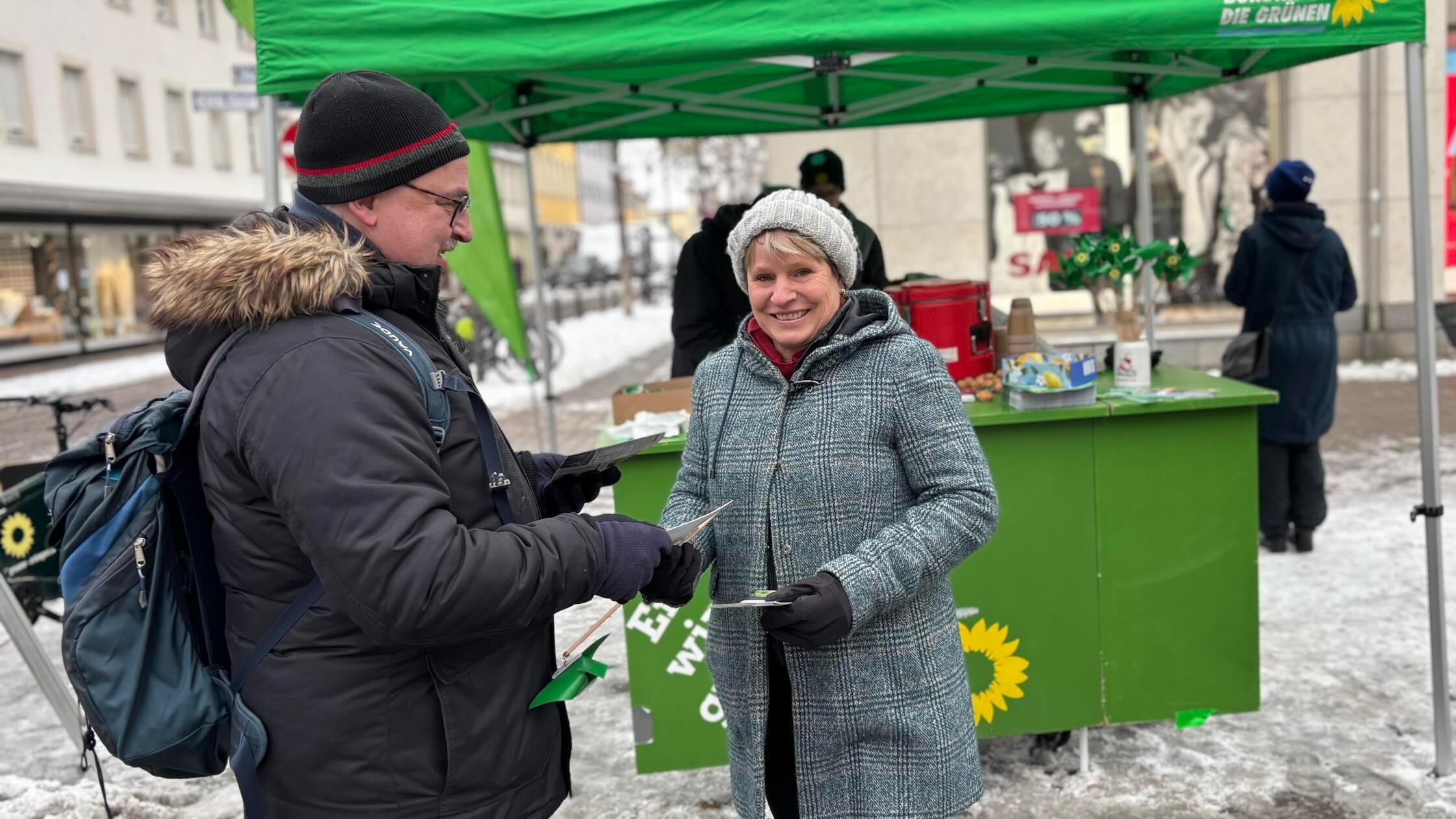 Auch bei eisigen Temperaturen wirbt die grüne OB-Kandidatin Eva Linhart am Info-Stand in der Erlanger Innenstadt um Stimmen für sich und ihre Partei. Am 9. Juni 2024 wurde durch einen Bürgerentscheid über die Zukunft der Stadt-Umland-Bahn (StUB) in Erlangen entschieden. Die Tram soll durch die Städte Nürnberg, Erlangen und Herzogenaurach fahren.