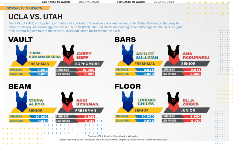 El equipo de gimnasia de UCLA, número 5 con un récord de 14-2 y 9-0 en la Substantial Ten, cerrará su temporada regular contra su rival, Utah, número 12 (13-3, 6-0 en la Big 12), este sábado en el Pauley Pavilion. Ambos equipos ya aseguraron sus segundos campeonatos de conferencia consecutivos, y este encuentro podría ser un anticipo de las batallas en la postemporada. La analista de Daily Bruin, Sofia Celis, ofrece un informe sobre las Red Rocks.