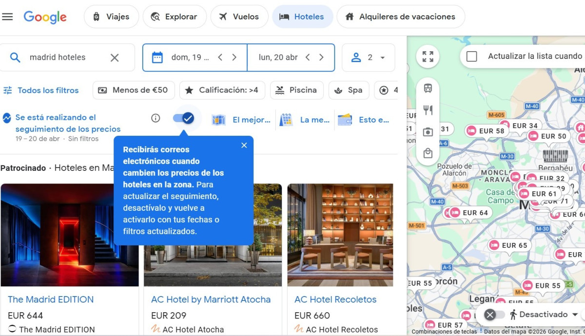 Además, es posible seguir individualmente los precios de hoteles específicos a través de la plataforma de Google.