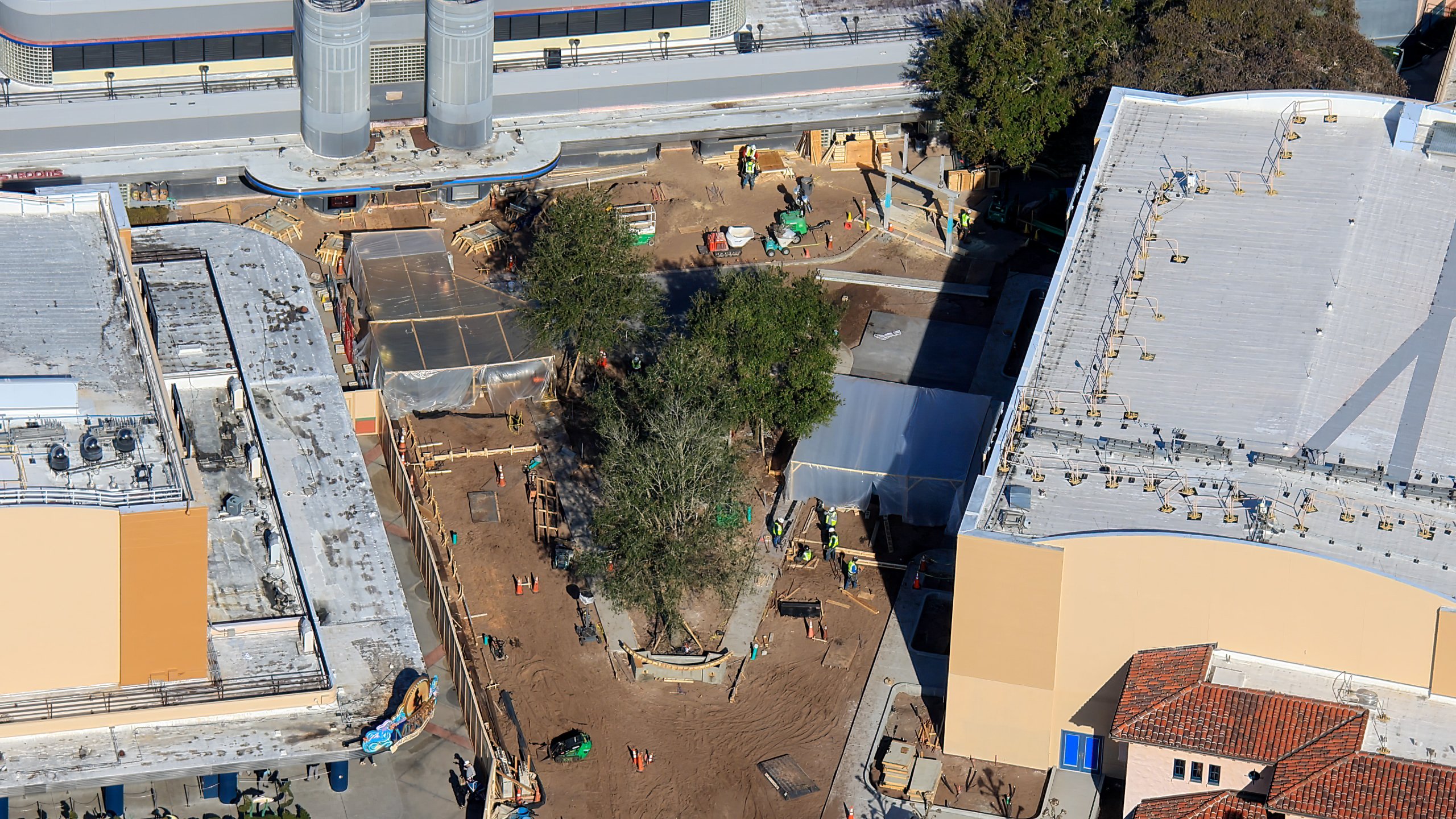 Una de las actualizaciones más llamativas es la plantación de nuevos árboles en el centro del patio. Varios árboles maduros ya están en su lugar, ocupando el espacio que antes era pavimento abierto, lo que marca la transición hacia un entorno más verde e inspirado en los estudios cinematográficos, tal como Disney había anticipado en los bocetos conceptuales. Estos árboles parecen dispuestos a enmarcar un área central tipo parque que servirá como el corazón de la nueva zona temática.