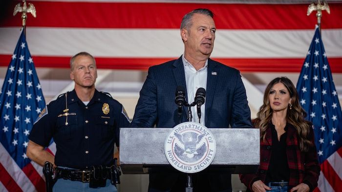 La secrétaire à la Sécurité intérieure Kristi Noem (droite) et le directeur par intérim de l’agence américaine du contrôle de l’immigration et des douanes (ICE) Todd Lyons (centre) tiennent une conférence de presse en Indiana, le 30 octobre 2025.