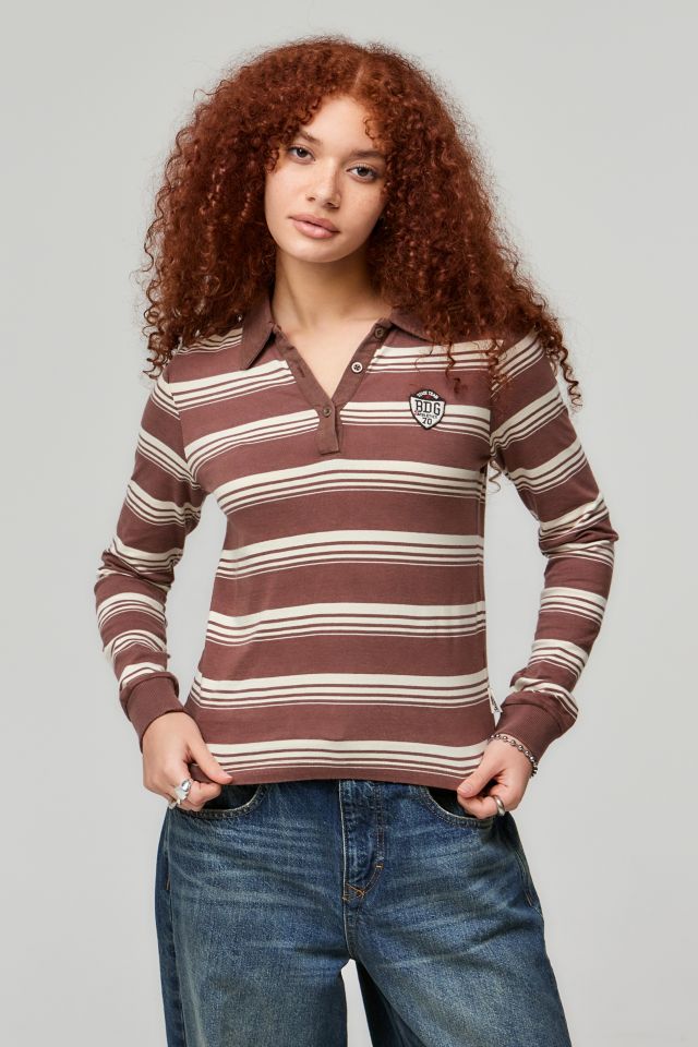 La estética inspirada en el rugby se integra en la moda casual a través de los suéteres de punto (knit) con rayas. Estas prendas, conocidas como rugby knit o rugby tee, se caracterizan por incorporar cuellos (collar knit) y diseños de rayas (stripe knit).