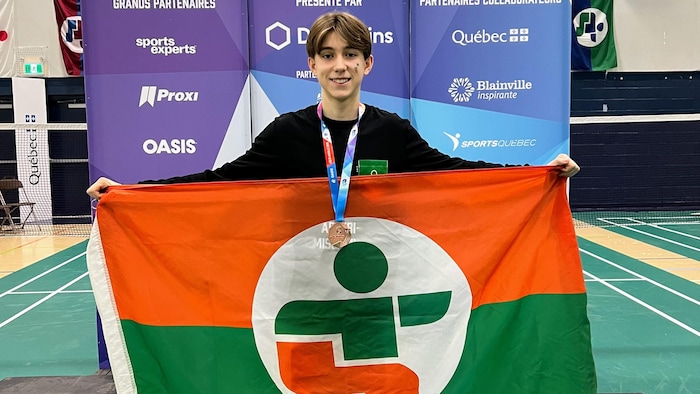 Thomas Huard pose fièrement avec le drapeau de la délégation régionale et sa médaille de bronze au cou.