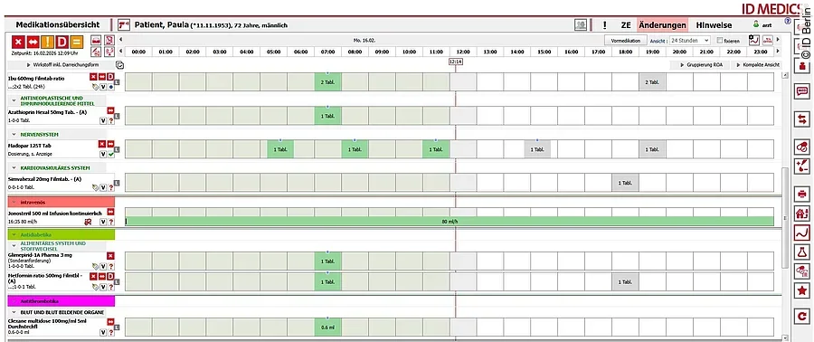 Un elemento central de ID MEDICS® es el soporte de decisión basado en inteligencia artificial ID PHARMA CHECK®. Utilizando algoritmos de última generación, las prescripciones se comparan continuamente con los datos del paciente, los valores de laboratorio y la información actual sobre medicamentos. Las indicaciones sobre interacciones, contraindicaciones, dosis máximas o reacciones adversas a los medicamentos se priorizan con precisión y se presentan gráficamente. La autoridad para actuar siempre permanece con el usuario, quien puede tomar decisiones fundamentadas basadas en información válida.
