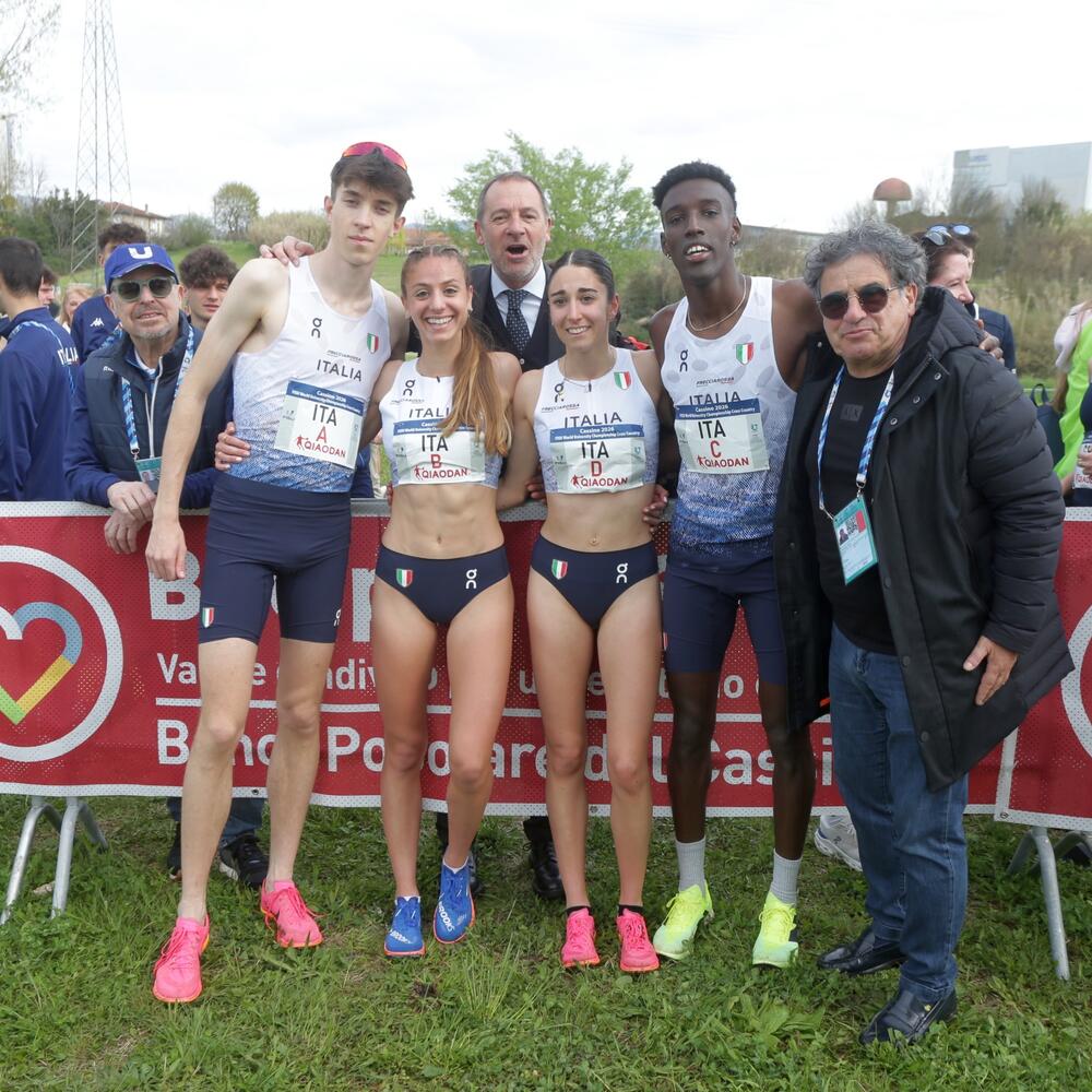 El cuarteto del relevo largo obtuvo el tercer puesto, con las dos primeras fracciones de 4,8 km y las dos últimas de 3,2 km: Dallapiccola comenzó en cuarta posición detrás de Uganda, Francia y España, y Moressa también corrió cerca de la zona de medallas, llegando a la quinta posición en el duelo con Austria. Francia y España se adelantaron, mientras que Cannizzaro remontó y entregó el testigo en cuarta posición a 23 segundos de Uganda, que sin embargo fue descalificada por un cambio fuera de sector (algo raro en el cross) y así Munaretto se hizo con el bronce. Francia (Martin Perrin, Clara Entresangle, Oscar Thebaud, Lola Darcy) dominó con un tiempo de 51:30, seguida de España (Jaime Migallon, Claudia Corral, Alejandro Quijada, Ambar Tomas), que obtuvo la plata con 52:18, e Italia, que cruzó la meta en 52:51, seguida de Canadá (53:21) y Austria (53:36) bajo la atenta mirada del presidente de la FIDAL, Stefano Mei. En el medallero, los italianos cerraron en segundo lugar, solo por detrás de Francia, que se adjudicó tres oros y un bronce.