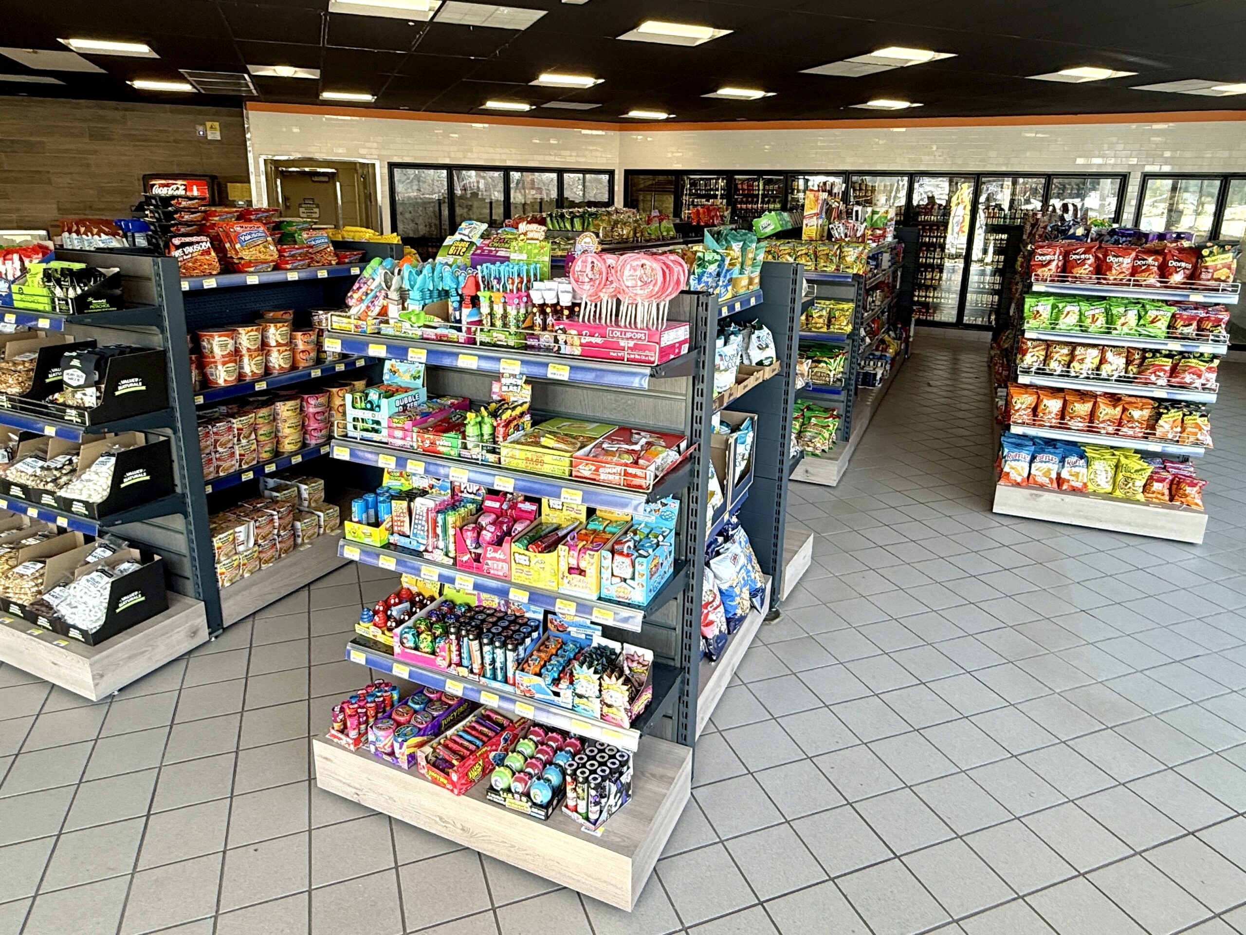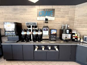 Visitamos la tienda y se observó bien surtida con bebidas en los refrigeradores y estantes llenos de los productos habituales. También cuenta con una estación de café y bebidas.