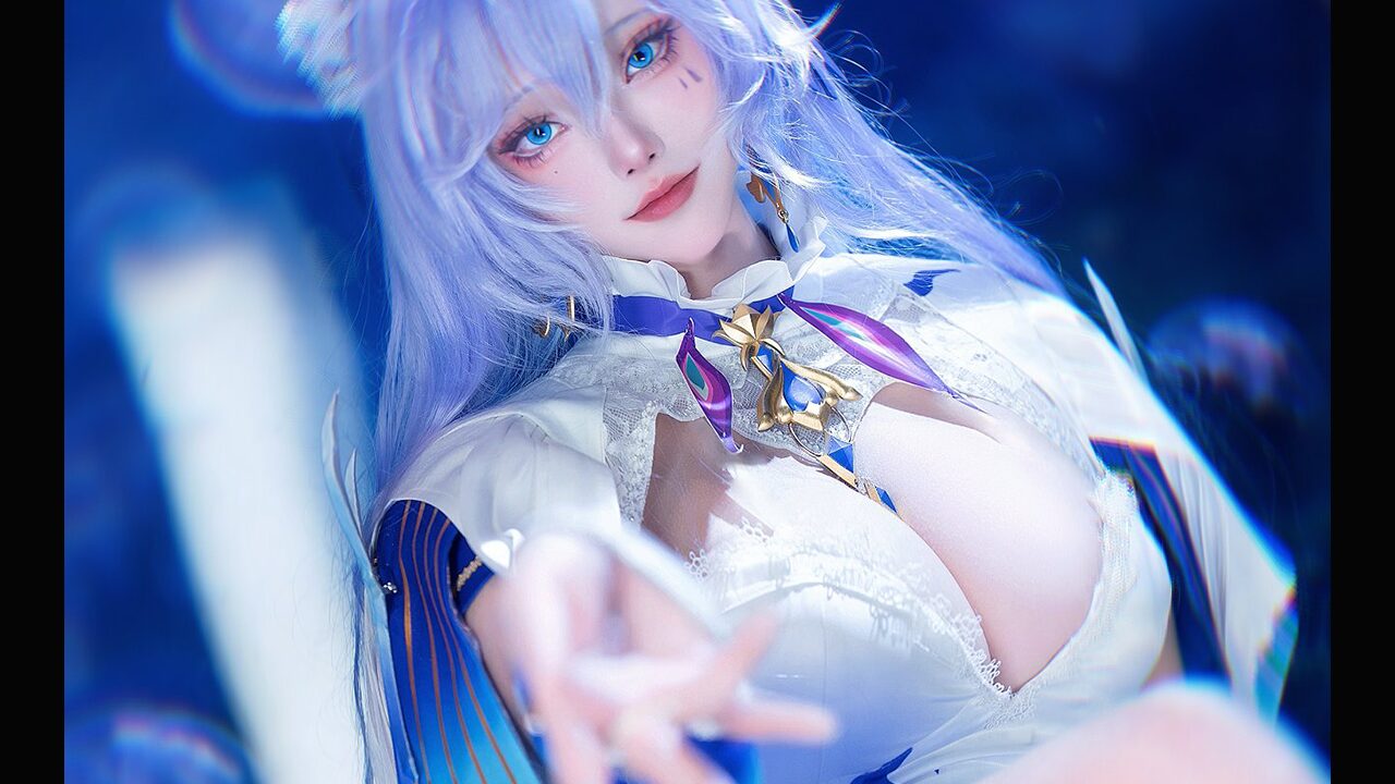 La iluminación azulada utilizada en la sesión fotográfica realza la atmósfera misteriosa y elegante de Cantarella. La combinación del blanco del traje, el plateado del cabello y el azul del fondo crean una armonía visual que captura la esencia del mundo del juego.
