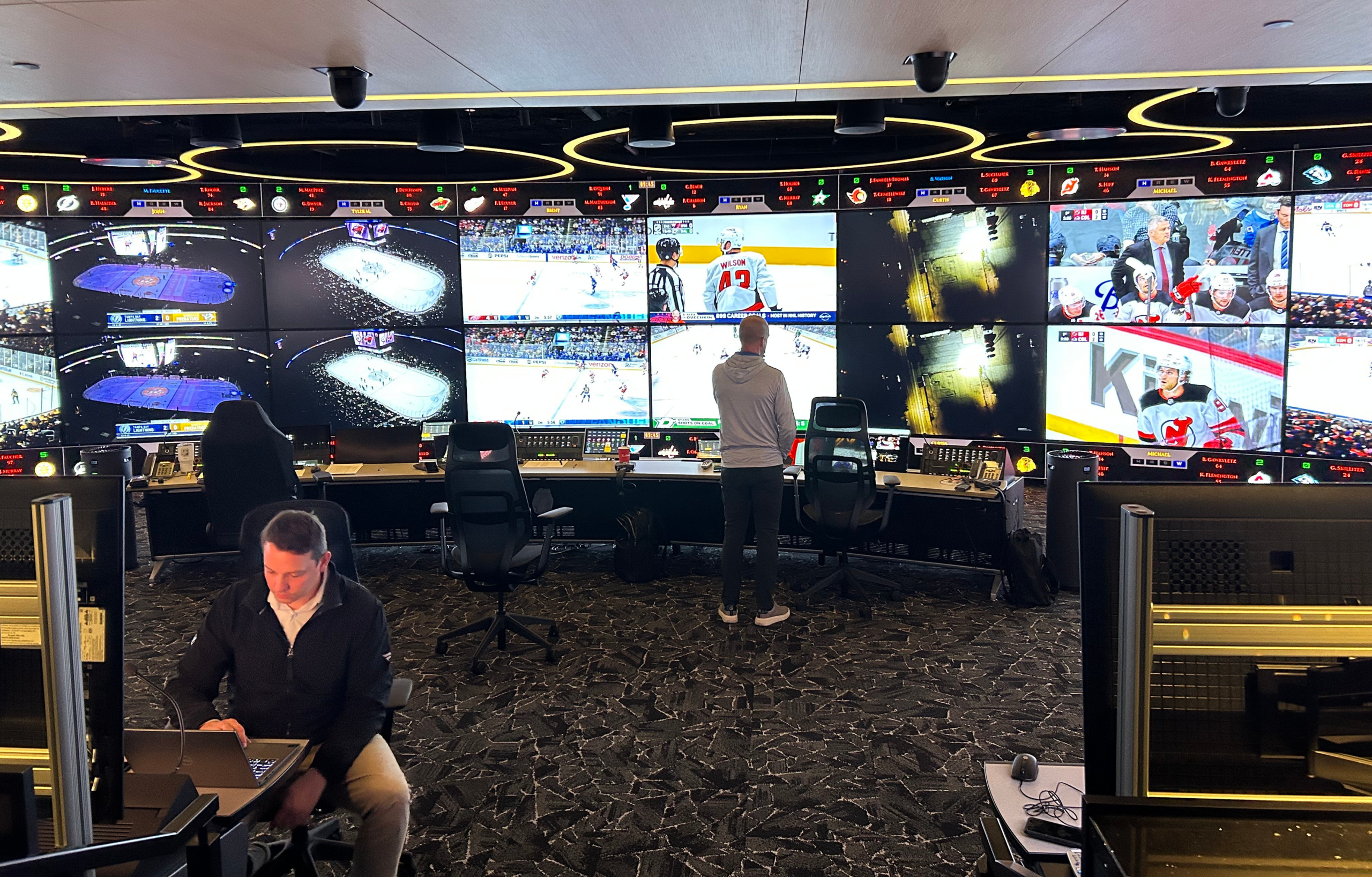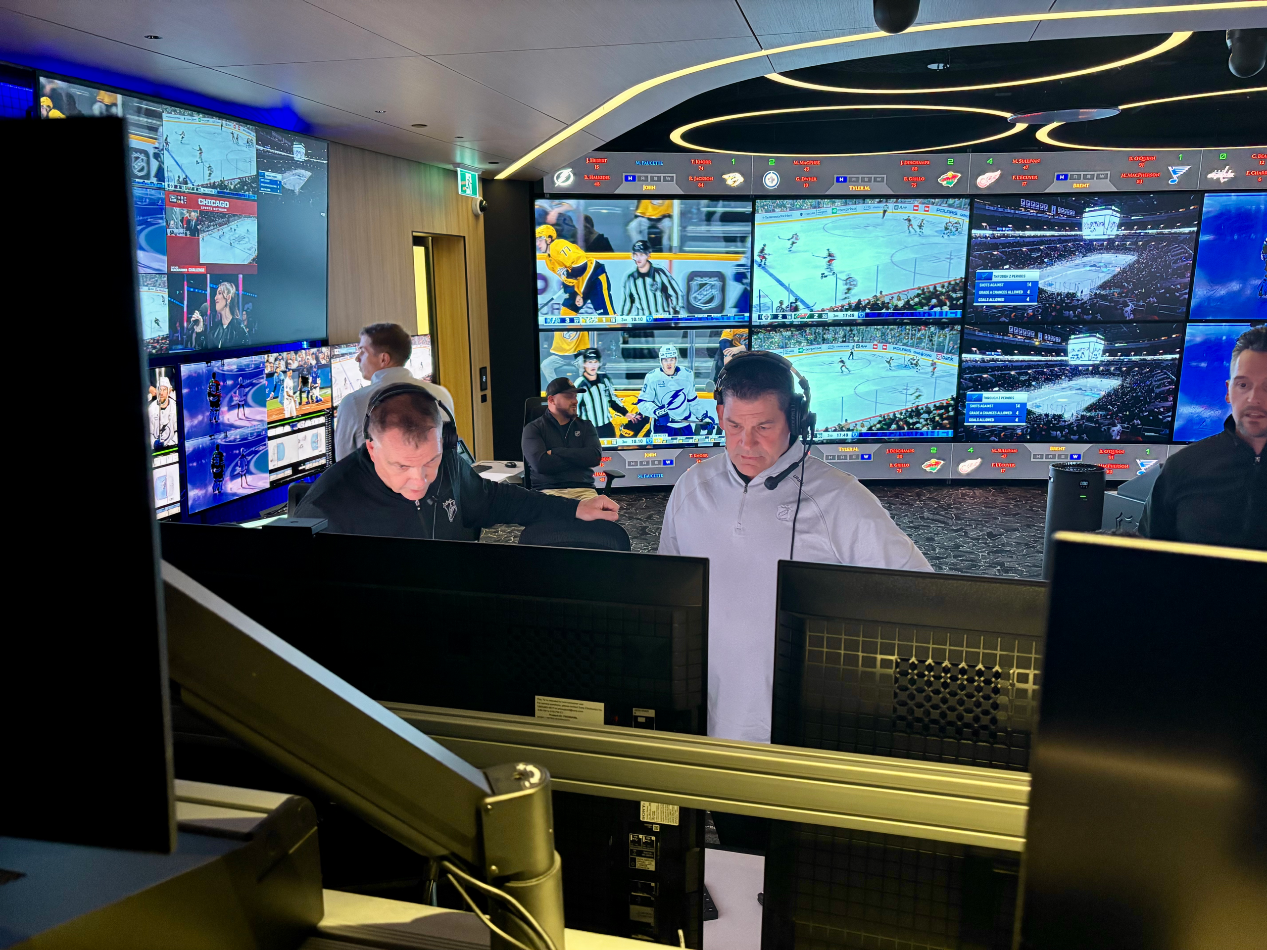 From the Situation Room, the NHL’s Kris King (center) is able to help monitor all games going on throughout the league.