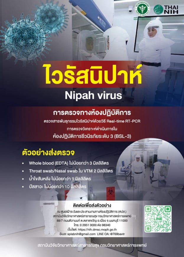 “Los hospitales pueden enviar muestras de pacientes sospechosos de virus Nipah con fiebre alta y antecedentes de contacto con animales o consumo de frutas sospechosas, o aquellos que regresan de áreas afectadas, para pruebas e consultas al Centro de Servicios del Departamento de Ciencias Médicas y al Centro de Coordinación de Análisis de Laboratorio y Vigilancia, Instituto de Investigación de Ciencias de la Salud Pública, Departamento de Ciencias Médicas.”