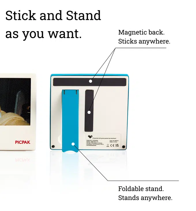 Picpak es un pequeño marco de fotos digital. El fabricante promociona sus dimensiones compactas, que permiten colocar la mini pantalla en cualquier lugar, incluso en el bolsillo. Las dimensiones exactas son 99 x 92 mm con un grosor de solo 6 mm, menos que un teléfono inteligente. Pesa solo 69 gramos, lo cual es excelente.