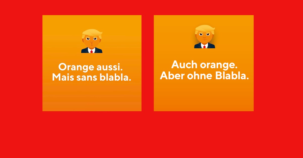 La pieza publicitaria se apoya en el eslogan: «También naranja. Pero sin palabrería» (traducción de «Auch orange. Aber ohne Blabla»), vinculando el colour asociado al político con la propuesta de valor de la compañía.