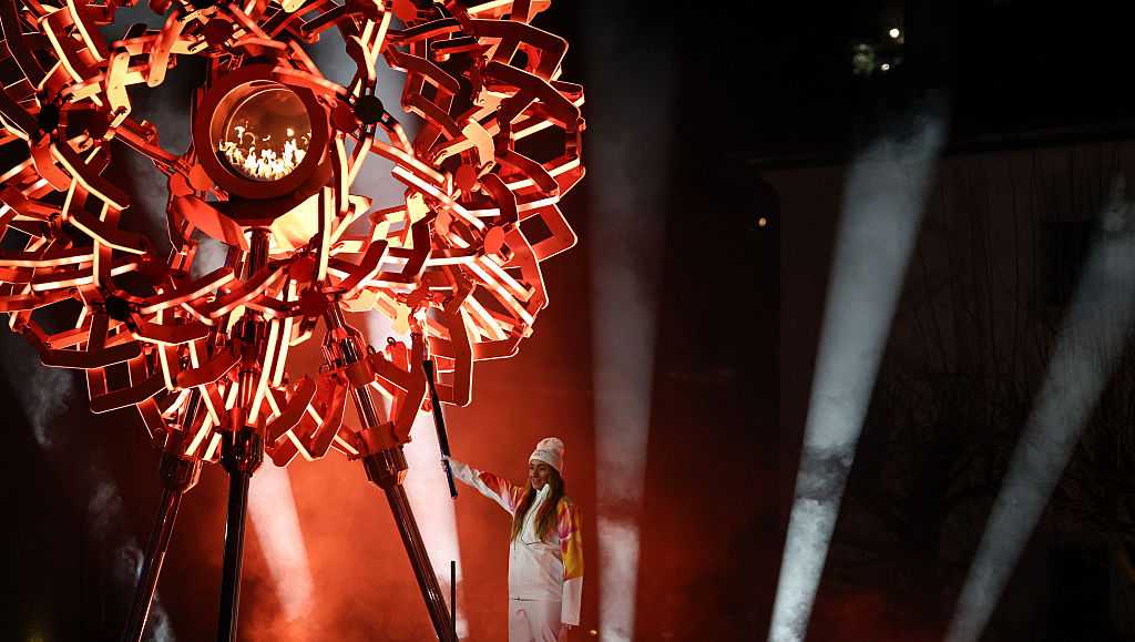Italian alpine skier Sofia Goggia holds the Olympic torch under the Cortina cauldron during the opening ceremony of the Milano Cortina 2026 Winter Olympic Games in Cortina d’Ampezzo, northern Italy, on February 6, 2026. (Photo by Franck FIFE / AFP via Getty Images)
