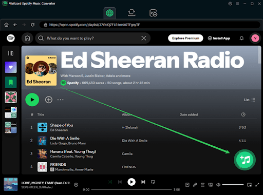 ViWizard viene con un reproductor web de Spotify integrado. Puedes navegar, buscar y descargar música directamente dentro del programa, sin necesidad de instalar la aplicación de escritorio de Spotify.