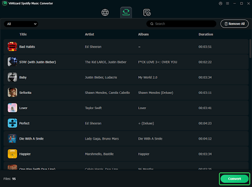 Haz clic en el botón Convertir. ViWizard comenzará a convertir instantáneamente tu música de Spotify a archivos MP3. Una vez finalizada la conversión, las canciones descargadas de Spotify se guardan en tu computadora Windows o Mac.