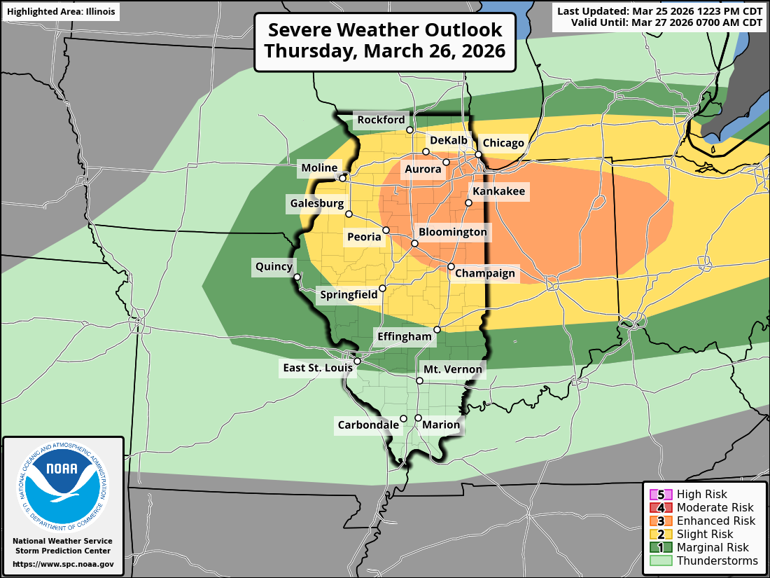 Se prevé que la peor parte del sistema se mantenga al norte de la Interestatal 72, con el área de St. Louis en riesgo marginal de tormentas. El riesgo elevado de tormentas cubre áreas al norte de la Interestatal 74, incluyendo Peoria, Bloomington y Champaign. Un riesgo leve de tormentas se extiende a través de Springfield y Effingham.