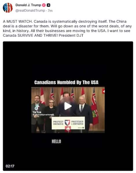 En esta ocasión, el mandatario utilizó un extracto de la rueda de prensa del jueves del gobierno de Ontario, encabezado por Doug Ford, quien había lamentado el acuerdo canadiense-chino negociado por Mark Carney.
