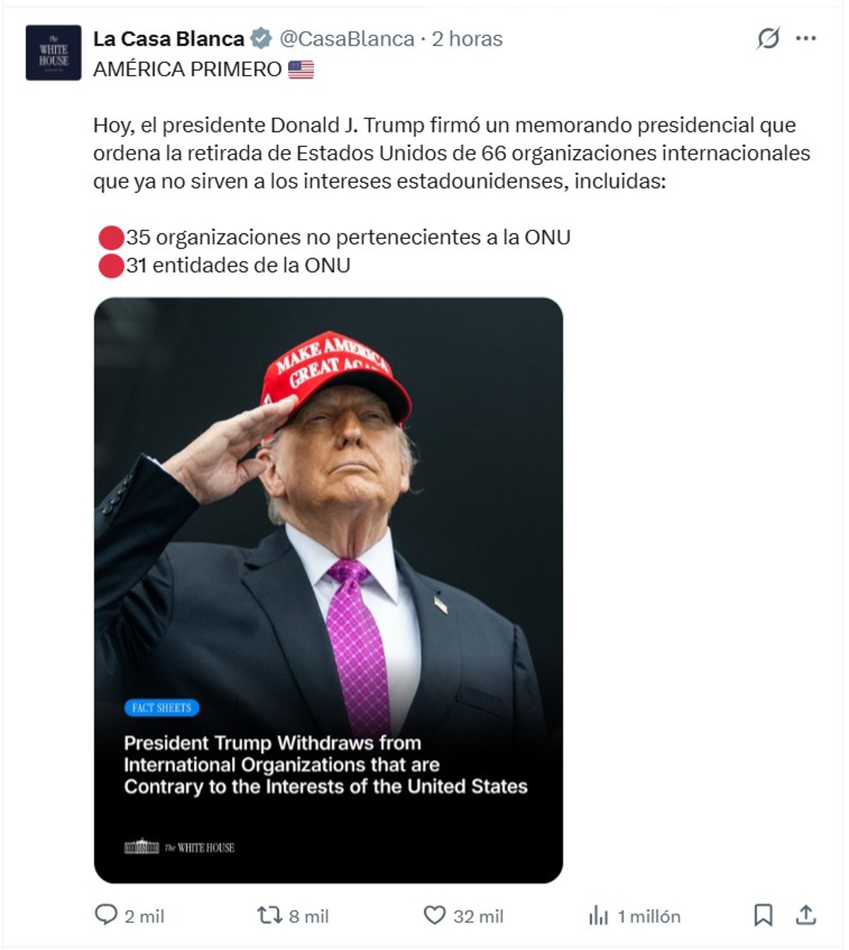 La Casa Blanca aseguró que esta decisión pondrá fin al financiamiento de estos organismos con fondos de los contribuyentes estadounidenses, permitiendo al país reasignar recursos a “prioridades internas y políticas que favorezcan su independencia”.