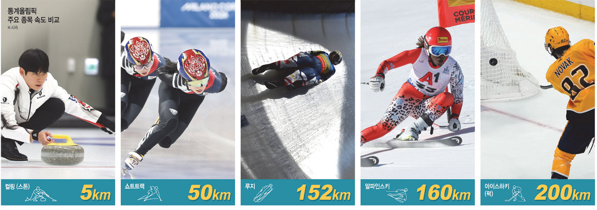 △ 150 km/h = El bobsleigh, el luge y el skeleton, conocidos como “Fórmula 1 sobre hielo”, utilizan la gravedad y las pendientes para acelerar, alcanzando una velocidad promedio de 130-140 km/h. El luge, en el que los atletas se desplazan en posición tumbada, es el más rápido, alcanzando una velocidad máxima de 150 km/h, seguido por el bobsleigh, que desciende a una velocidad promedio de 130-140 km/h. El skeleton, en el que los atletas se desplazan boca abajo, alcanza velocidades de alrededor de 130 km/h; Yun Sung-bin registró una velocidad máxima de 124,2 km/h durante los Juegos Olímpicos de Invierno de Pyeongchang 2018.