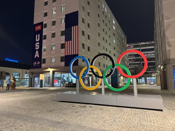 En el corazón del Villa Olímpica se encuentra la estatua de los anillos olímpicos. Para los atletas, tomarse una foto junto a los anillos es un rito de iniciación y una forma de celebrar su logro de participar en los Juegos Olímpicos, un momento que capturan a todas horas del día.